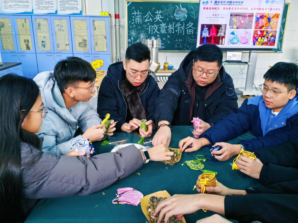 在体验课堂上,李彩文老师以“神农尝百草”的经典故事切入,生动阐释了中医药香囊深厚的文化渊源与实用功效,并悉心指导学生们亲手配制、装填药材香料,制作专属的个性化香囊。课堂还巧妙融入了中药耳环DIY、中医药标本鉴赏、中草药养生锤展示等环节。这种多维度、沉浸式的实践体验,将中医药“如‘药食同源、寓养于生活’”的生活智慧具象化呈现,让学生们在亲手创作的过程中,深切感受到了中医药文化的博大精深与独特魅力。