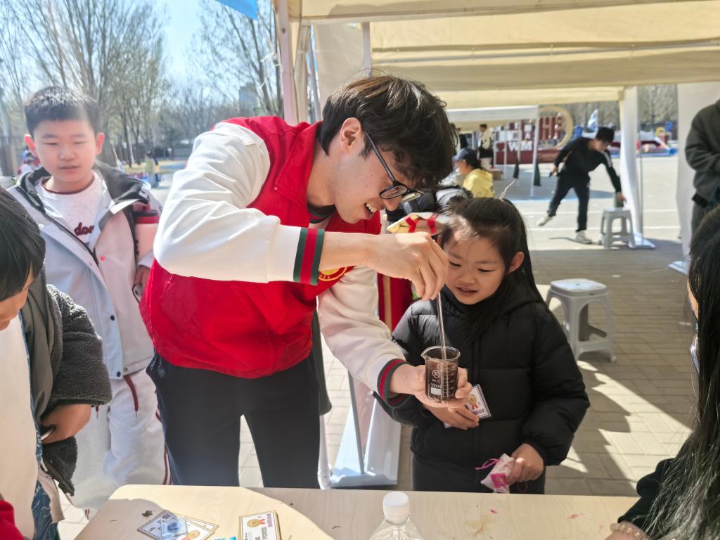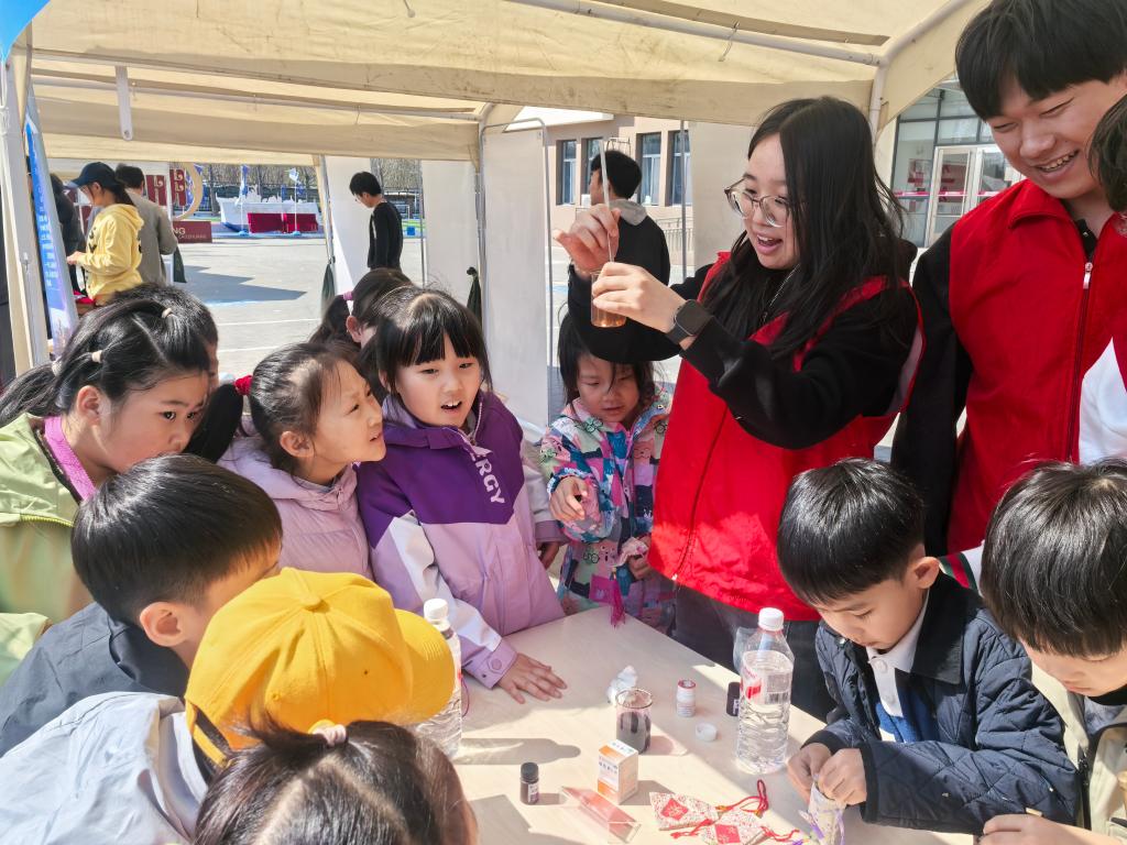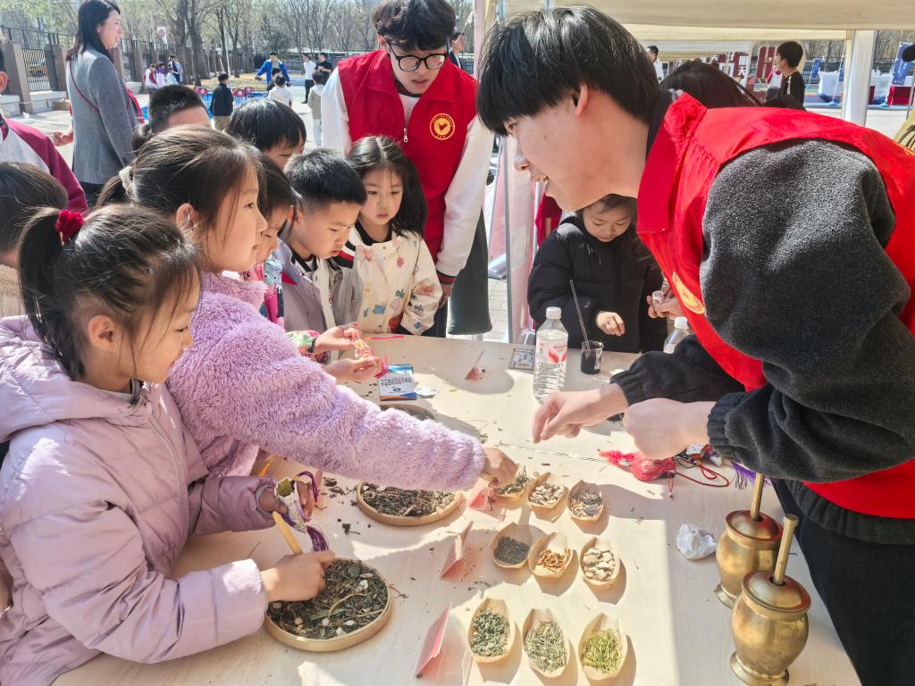 活动现场,科普团志愿者化身魔术师,展示了经典的化学实验“消失的颜色”,用通俗易懂的语言讲解氧化还原反应理,将课本上深奥的化学知识变成了触手可及的神奇现象,在孩子们心中播下了化学的种子。在中药香囊DIY展位,志愿者们不仅引导孩子们通过“看、闻、摸”的方式辨识药材,还讲解了中医药在预防疾病、养生保健方面的智慧。在志愿者的指导下,小学生们动手将磨好的药材装入精美的锦囊,制作出一个个香气扑鼻、形态各异的中药香囊,不仅锻炼了动手能力,更零距离感受到了中医药文化的独特魅力。