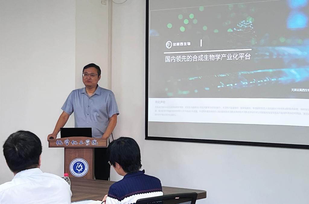 专题报告环节,田东奎董事长结合天津法莫西医药科技有限公司的发展历程、科技研发成果和行业发展特点,围绕“国内领先的合成生物学产业化平台”建设主题作精彩报告,并与参会教师展开深入研讨交流。